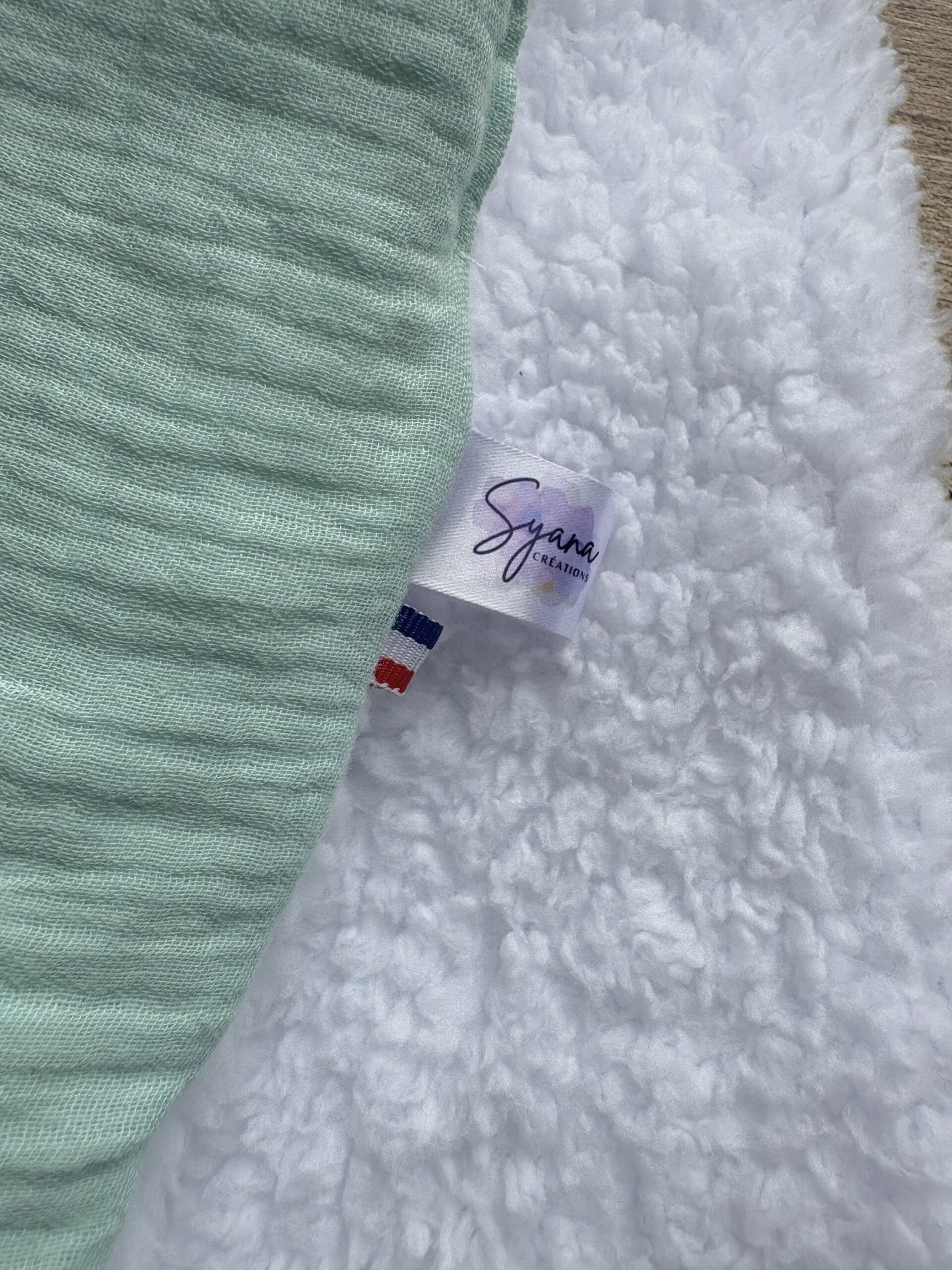 Remplie de tendresse, la couverture en double gaze de coton et en fausse fourrure de mouton peut être personnalisée avec le prénom de l’enfant. (voir photo ou lien juste ici)